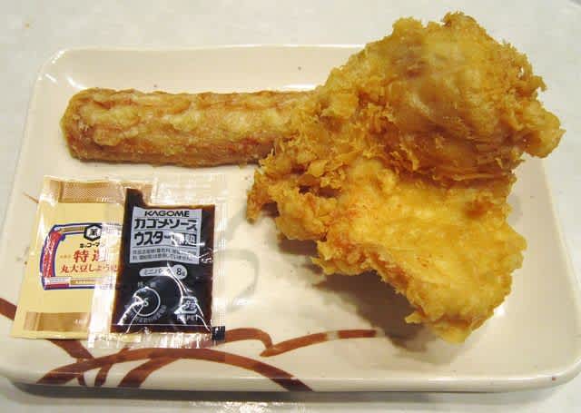 追加トッピングは不要だったけど、ついブログのために買ってしまった。ちくわ天と鶏天。鶏天はこの大きさで145円。食べ応えがあって高いとは感じない。