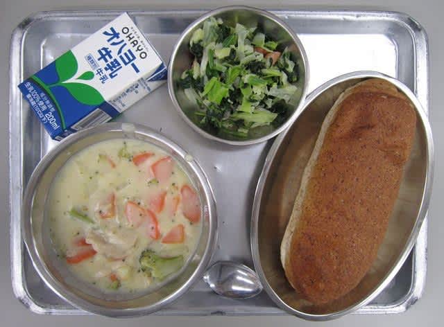 昼食:胚芽パン、クリームシチュー、ほうれん草サラダ