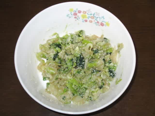 本当は大根の葉で作りたいんだけど、手に入らないので水菜。味付けはハウスの炒飯の素。焼豚やソーセージを入れたりしない。油っぽくなるから。この料理には竹輪が良い。かまぼこやなるとでも良いのだけど、なるとはめったに使わないから買い置きがないし、かまぼこは中に入れると固くなるので良くない。色合いが良くなるからそれは良いのだけどね。