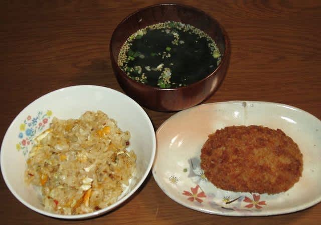 朝食:永谷園のインスタントチャーハン(半分)、コロッケ、インスタントのわかめスープ