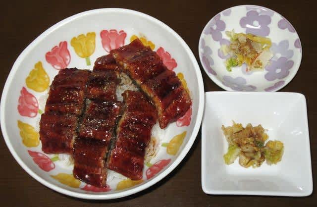 夕食:うな丼、吉野家の漬物二種