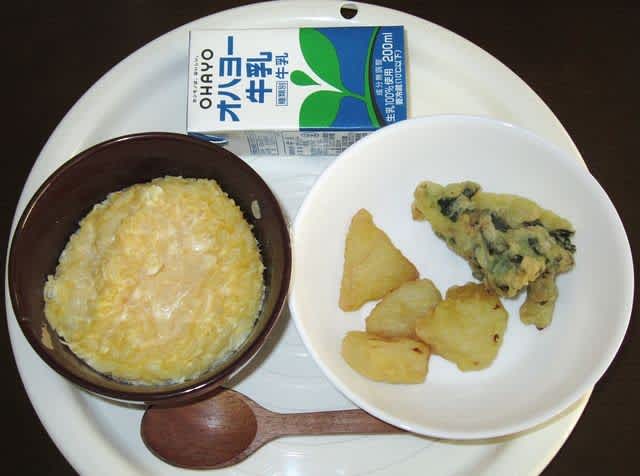 朝食:雑炊、菜の花と筍の天ぷらの残り