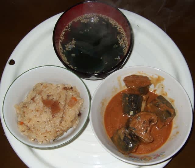 海藻が体に良いかなと思って、インスタントだけどお汁にした。缶詰はサバの味噌煮。好きなので。
