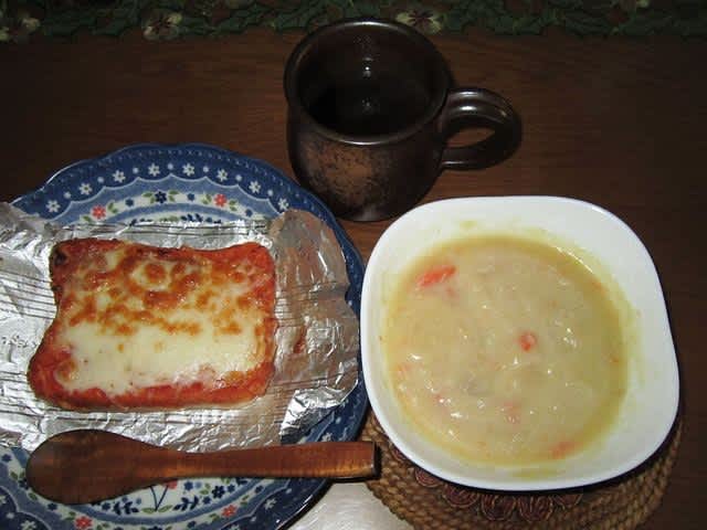 モッツァレラをトッピング。紅茶はボンマルシェ。シチューの残りはパスタにかけたかったんだけど、これで終わっちゃった。