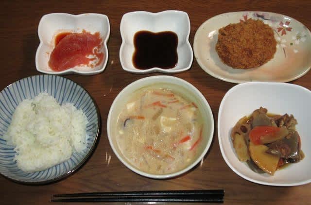 今までの残り物と、買ってくれたミンチカツ1個。まぁ食べられるだけは食べた。