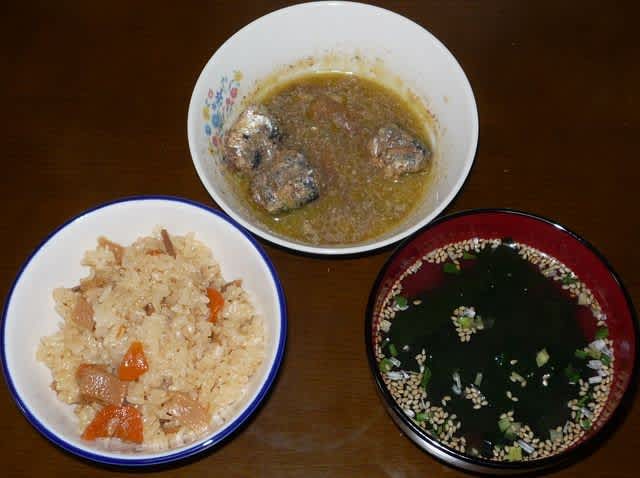 朝食:鶏釜飯、イワシ缶、わかめスープ