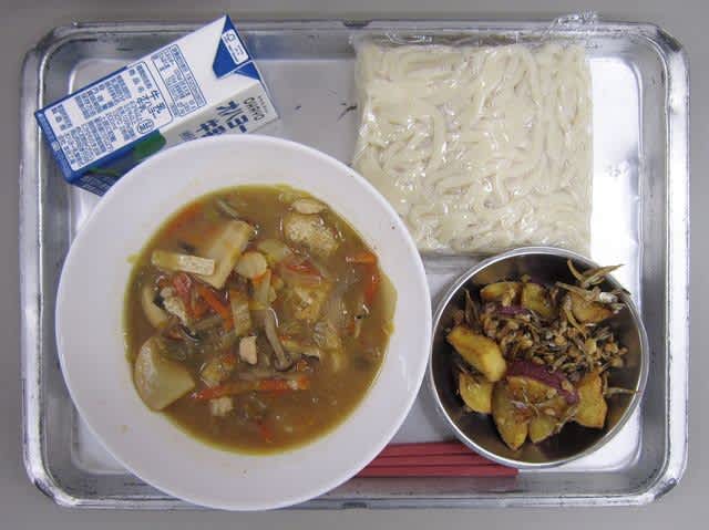 昼食:味噌うどん、小魚とサツマイモの胡桃和え