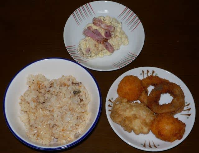 朝食:筍ご飯、大人のポテトサラダ、イカフライ各種