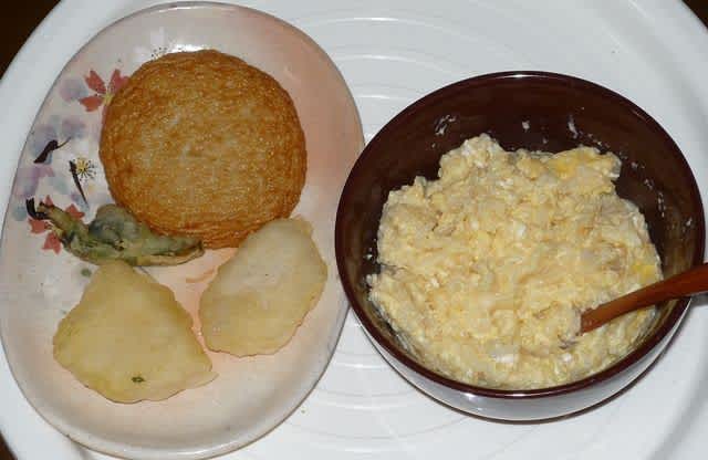 朝食:雑炊と丸天、天ぷらの残り
