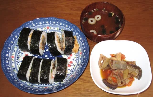 夕食:節分の太巻き+残り物、松茸の味お吸い物
