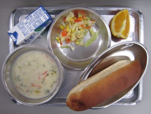 昼食:ホタテのチャウダー、コールスローサラダ、黒糖パン、ネーブル
