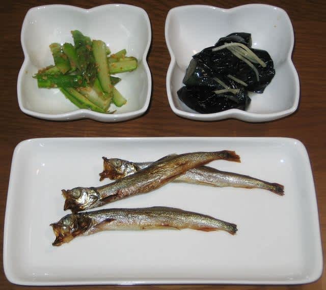 蕎麦と冷や奴はリクエストした。それ以外は、私が「肉系は止めて魚にしよう」「揚げ物は控えよう」と言っていたので、これらにしたのだそうだ。アスパラは非常に美味しかった。これは家で作ったのだけど、茄子は買ってきた惣菜。