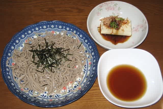 夕食:和蕎麦、冷や奴、茄子の揚げ浸し、ししゃも、アスパラのピーナッツ和え