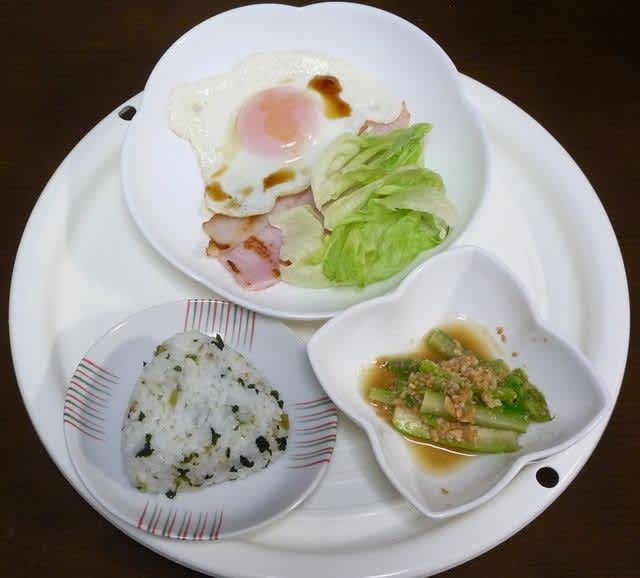 朝食:若菜おにぎり、ベーコンエッグ、アスパラのピーナッツ和え