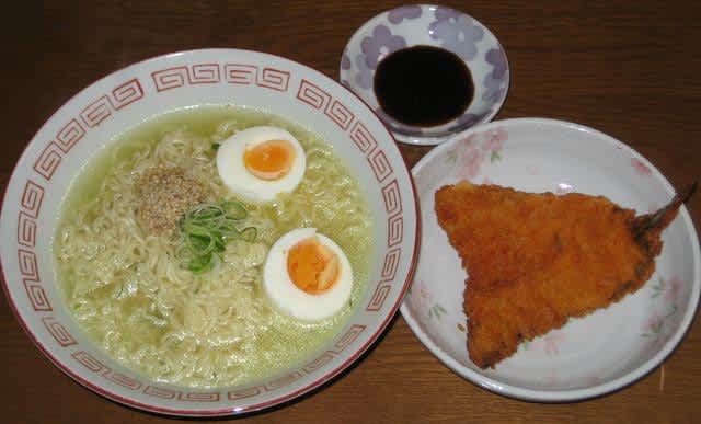 と言うことで塩ラーメンを作ったのだけど、フライまで買ってくれていたので驚いた。これ好物なのです。