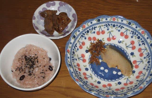夕食:残り物の赤飯、魚、買ってきた肝とアジのフライ