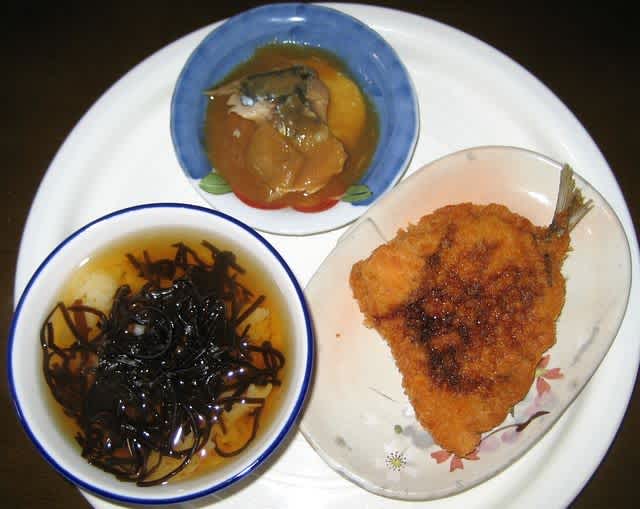朝食:塩ッペ茶漬け、残ってたサバの味噌煮、アジのフライ