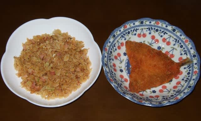 炒飯は、この前お好み焼きを作ったときに余った春キャベツやベーコンで作っておいたもの。久しぶりにハウスの炒飯の素を使った。