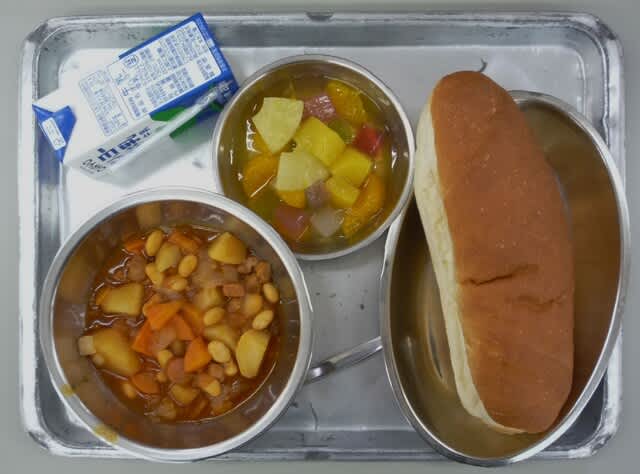 昼食:ポークビーンズ、フルーツポンチ、米粉パン