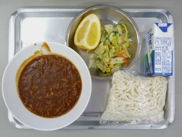 昼食:ミートソース麺、フレンチサラダ、河内晩柑