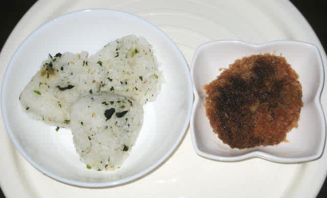 朝食:おにぎり山のおにぎり、ミンチカツ