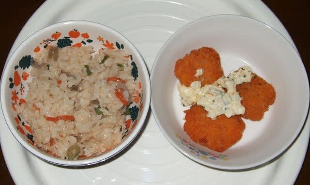 この山菜炊き込みご飯はホントにヒットだな。美味しい。さすがに朝には量が多すぎて1/3は残した。一口フライは全部食べた。