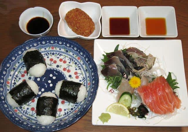 夕食:おにぎり、刺身、蓮根コロッケ 他