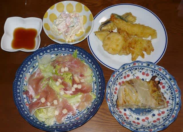夕食:天ぷら半セット、豚肉と白菜、生ハムのシーザーサラダ、マカロニサラダ