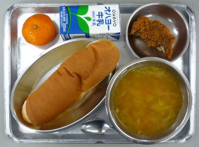昼食:米粉パン、レタスとコーンのスープ、白身魚のハーブフライ、冷凍ミカン
