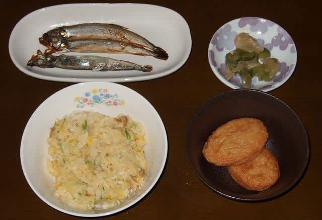 朝食:炊飯器炒飯、ししゃも、さつま揚げ、搾菜