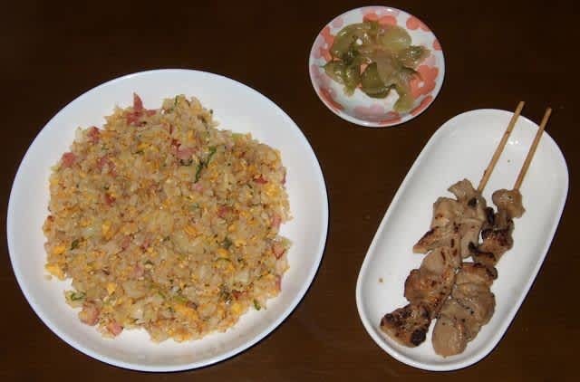 お好み焼きを食べるつもりだったけど、明日が生ゴミの日と言うことで冷蔵庫を掃除してゴミを出しておきたかった。ネギ、キャベツ、タマネギ、ベーコンが残っていたので、ウエイパーの炒飯にした。2皿分できた。折角だから一皿食べた。この焼き鳥はいつものより一ランク上の味。大変旨い。アントマンで買ったそうで、『結構高かった』だそうだから良い肉を使っているのだろうな。
