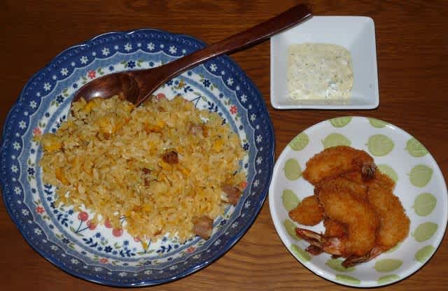 朝食:冷凍炒飯、エビフライ