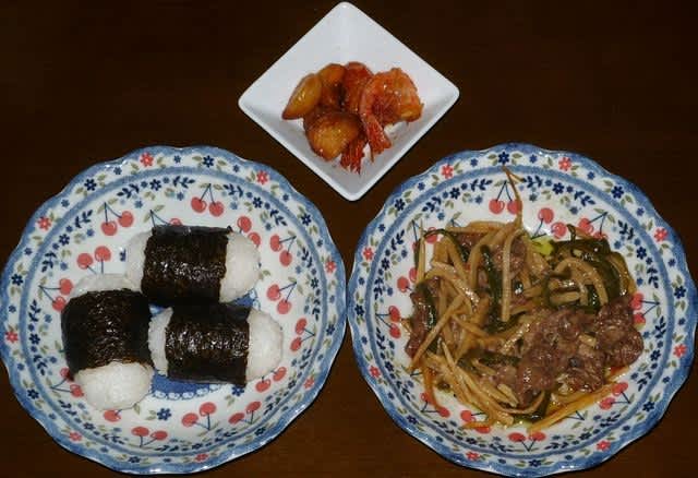 朝食:おにぎり、青椒肉絲、エビとにんにくの甘煮