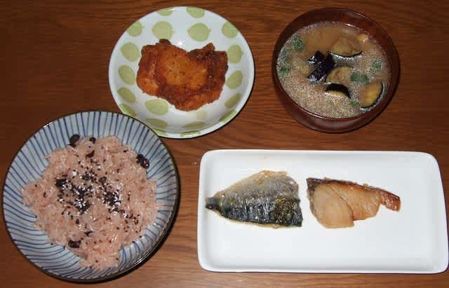 昼食:赤飯、ナナチキ、茄子の味噌汁、サバとサワラ