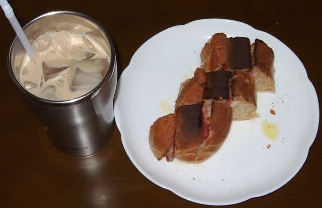 職場の食事で食べずに持って帰ったパンの半分。切れ込みを二つ入れ、焼いたベーコンととろけるチーズを入れて焼いた。その後にバター塗ったのだけど、レタスなどの葉物がなかったので見た目もイマイチになった。