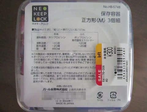 これすごく気に入ってます。4方向をしっかり止められるので汁物もこぼれない。パッキンが入っていて非常にしっかりしている。これは3個セットだけど、少し大きいやつは2個セット。並べても、パッと見た目はわからないぐらいの大きさ。こっちは460mlの容量で、大きい方は640mlだったと思う。正直、少しの差なら個数が多い方が嬉しい。どちらも300円。
