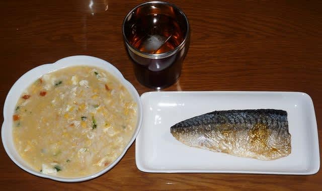 夕食:ちょっと雑炊(カニ)、セブンのサバ