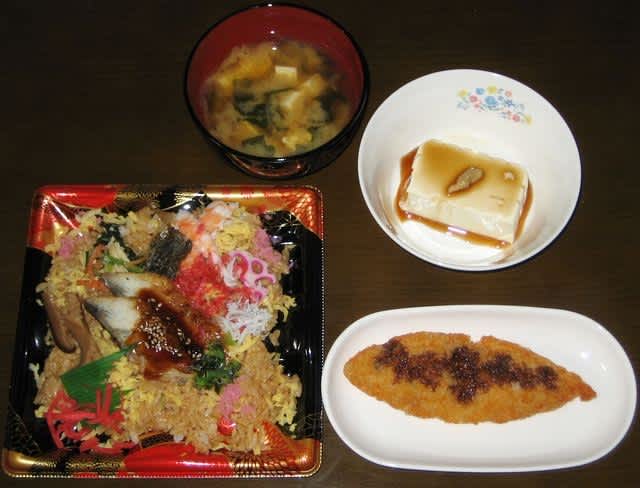 昼食:ウナギ入りちらし寿司、冷や奴、自作味噌汁、白身魚フライ