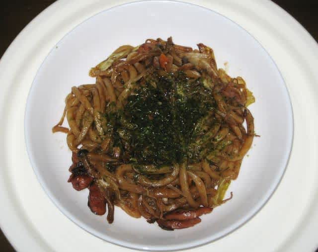 3食100円の麺と残っていた野菜で作った焼きうどん。色は濃いけど薄味。あまり濃いのが好きじゃないので。