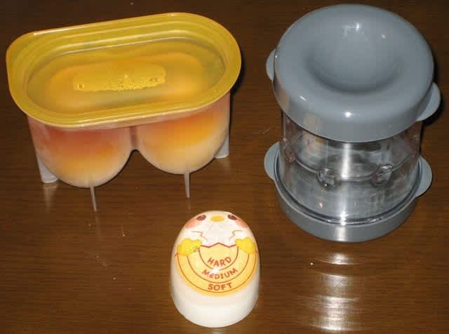 右上のはゆで卵の殻をきれいに剝くための器具。ゆで卵をこの中に入れて上下左右にフリフリすると殻にひびが入る。そうしたらきれいに剥けるのとのこと。実際にやってみたら実にきれいに剥ける。笑えるぐらいに。