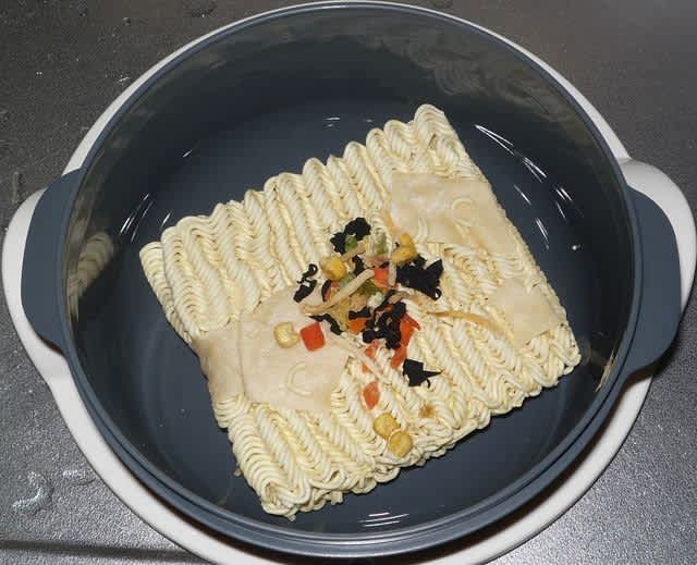 以前も似たようなのを持っていた気がする。ただしそれはタダのラーメンどんぶりだったような気もする。これは、袋麺を容器に入れ、指定量の水を入れてレンジでチンしてできあがりの容器。ダイソーに行ったら二種類あって、どちらも税込110円だった。多分左の黒い方が新商品で、右が旧だと思う。100円だし両方買ってみた。