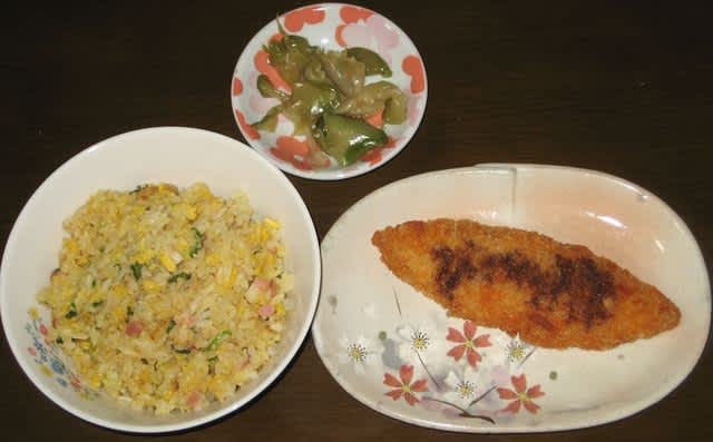 朝食:残り物で作った炒飯半分、白身魚のフライ、搾菜