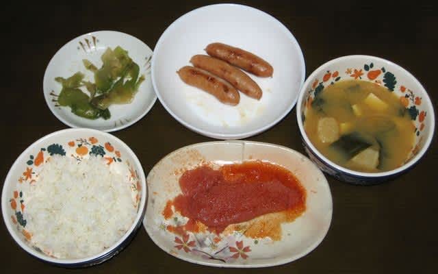 朝食:辛子明太子、搾菜、味噌汁、シャウエッセン