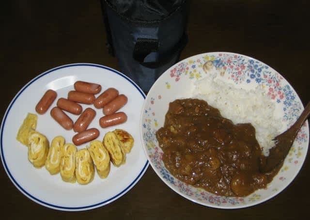 作り置きがいくらか残っていて、焼きそばと練習で作ったキャベツ焼きにしようかと思っていたのだけど、カレーの方を先に食べなきゃと思い直してこれにした。卵焼きは久々に食べたかったので作って貰った。