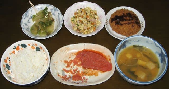 夕食:ヤマザキのミンチカツ、炒り卵、搾菜、明太子、味噌汁
