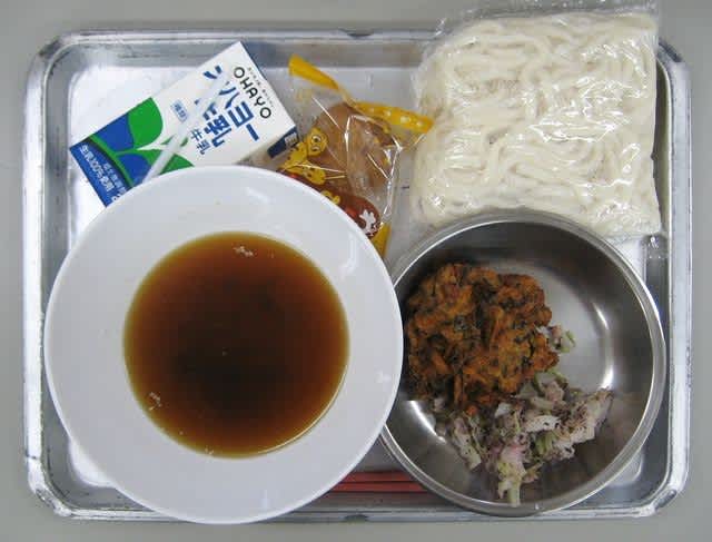 昼食:あっさりうどん、テンペ入りかき揚げ、ゆかり和え、わらび餅