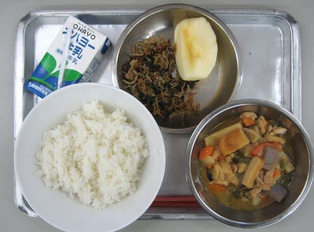 昼食:うま煮、手作り青菜ふりかけ、りんご
