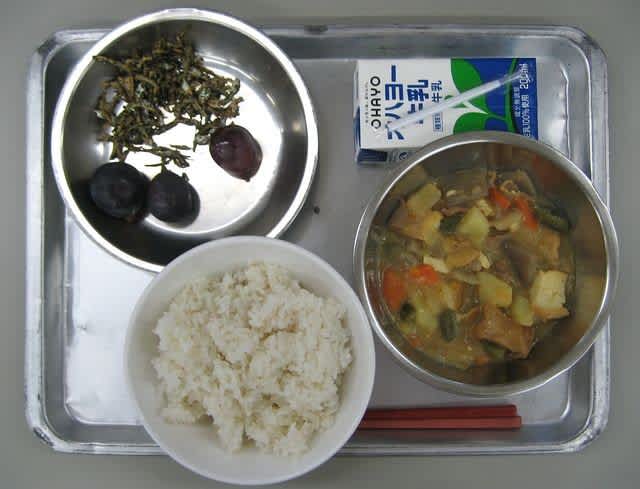 昼食:煮干しのり味、厚揚げの味噌煮、麦ご飯、ニューピオーネ