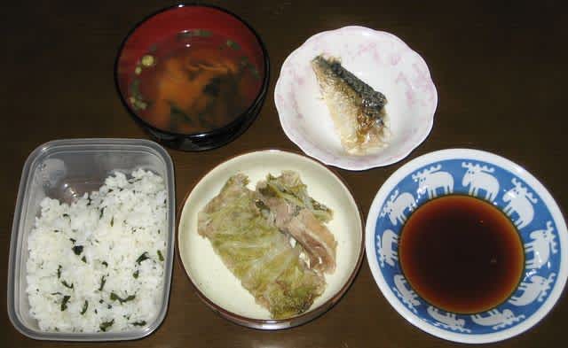 朝食:わかめご飯、豚肉と白菜のミルフィーユ、あさげ、セブンのサバの残り