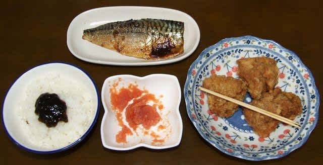 夕食:ご飯、明太子、海苔佃煮、唐揚げ、期限切れの魚